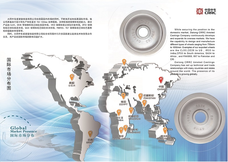 大同中车爱碧玺铸造有限公司在稳固国内市场的同时,不断地开发和拓展国际市场。我公司具备自行设计和生产车轮直径750~1050mm各种规格、各种标准的铸钢车轮的能力,部分产品如CJ33、CE28等铸钢车轮产品已进入美国市场,IR33铸钢车轮进入印度市场,CP33铸钢车轮进入南美市场,SA34铸钢车轮已销往非洲市场,PAK950、957铸钢车轮已销往巴基斯坦和独联体市场。