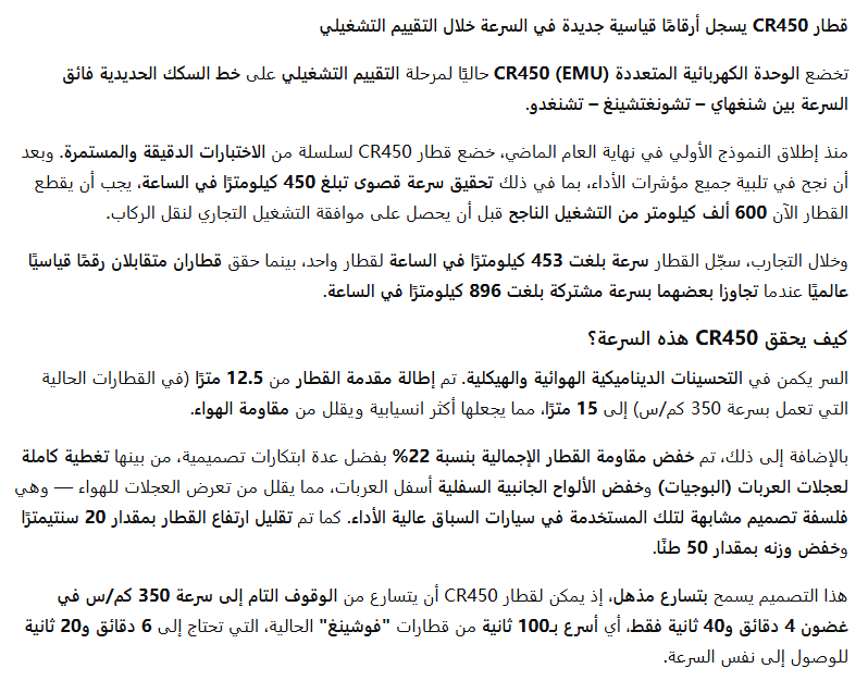 قطار CR450 يسجل أرقامًا قياسية جديدة في السرعة خلال التقييم التشغيلي