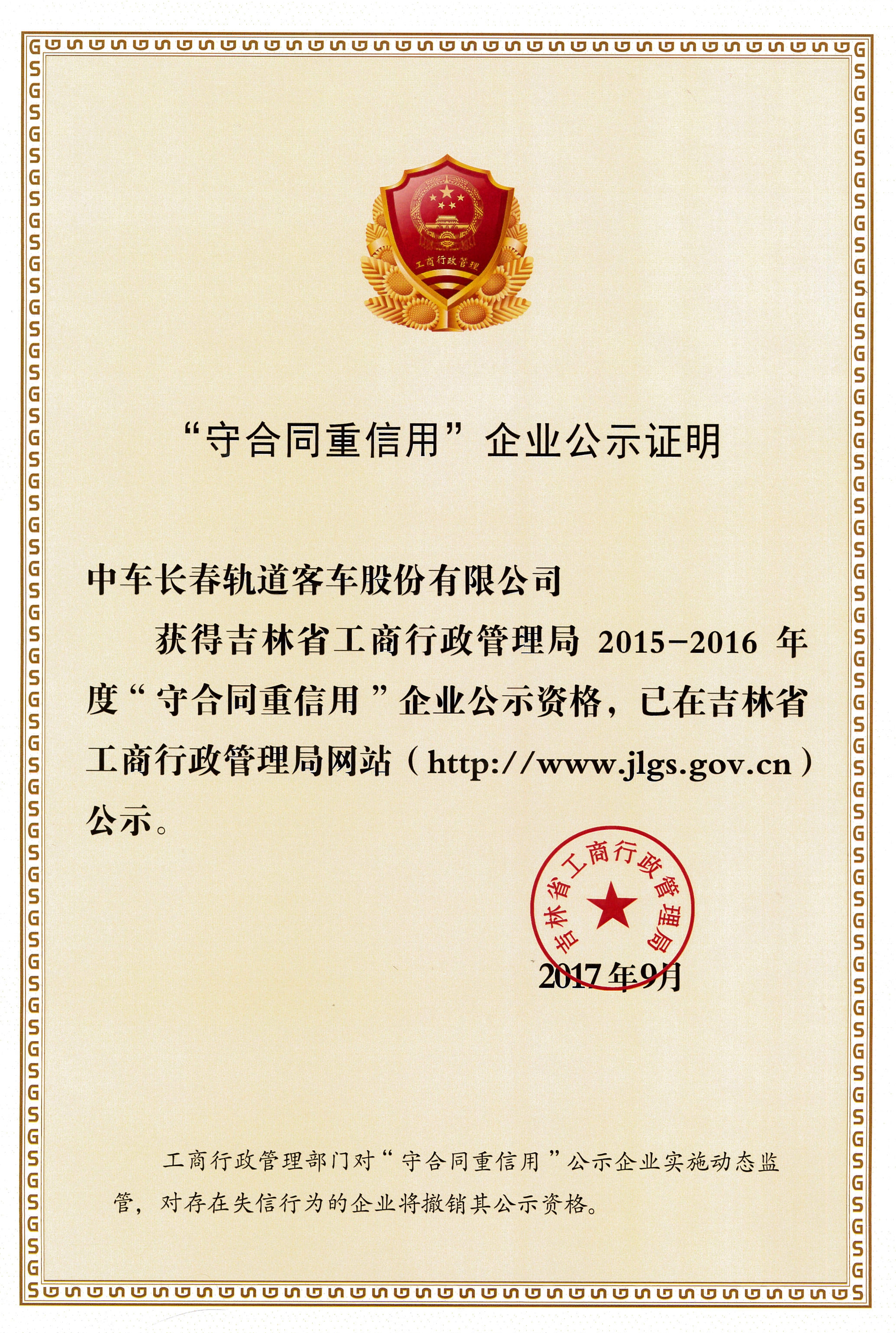 公司获得吉林省工商管理局颁发的2015—2016年度吉林省“守合同重信用”企业荣誉称号