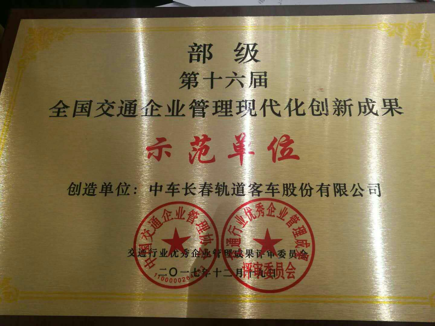 公司获第十六届全国交通企业管理现代化创新成果示范单位荣誉称号