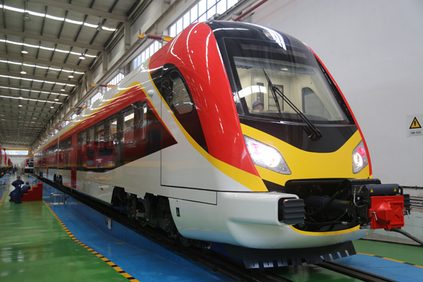 当天,在马其顿交通部长Mr. Vlado MISAJLOVSKI,湖南省副省长黄兰香,中国中车副总裁楼齐良,以及马来西亚、捷克、格鲁吉亚、乌兹别克斯坦等国家铁路部门负责人等见证下,具有鲜明马其顿国家风格的动车组隆重驶下生产线。
