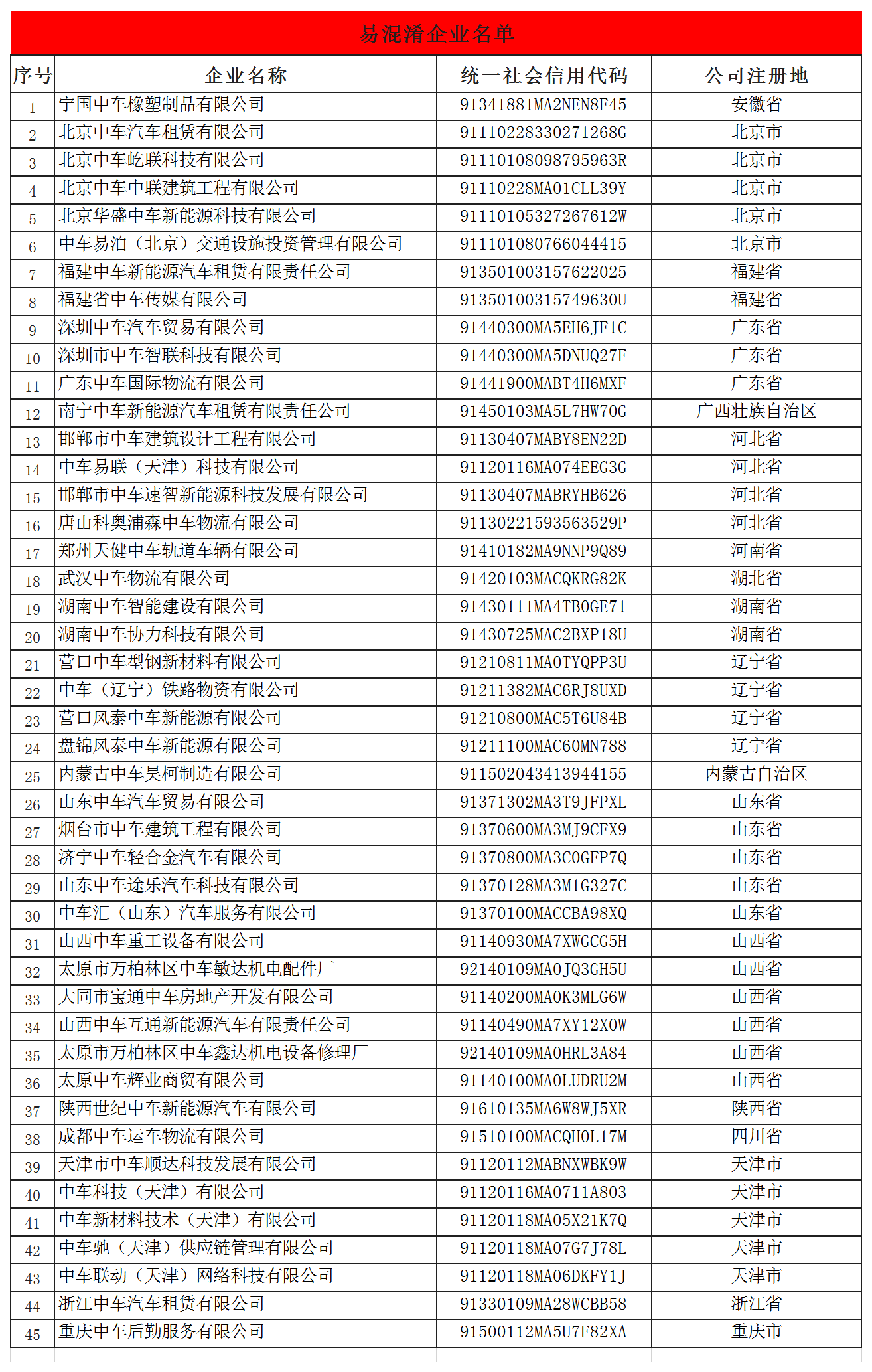 此次公告涉及45家第三方企业,中国中车将视情况更新澄清名单。此次公告中涉及的公司及“国家企业信用信息公示系统”中显示与中国中车无隶属或股权关系的第三方企业,其相关市场经营行为与中国中车及所属各级子公司无任何关联。