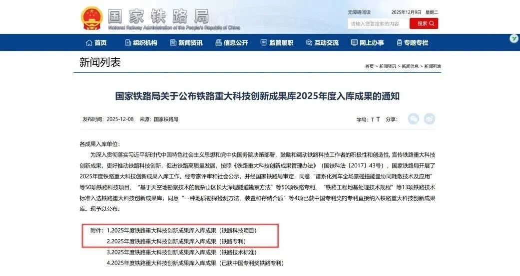 此次成果入库工作是国家铁路局为深入贯彻落实习近平新时代中国特色社会主义思想和党中央国务院决策部署,激励铁路科技工作者创新创造、宣传推广重大科技创新成果、推动铁路科技创新和高质量发展而组织实施的权威认定。经严格的专业评审、社会公示及国家铁路局最终审定,共有50项铁路科技项目、50项铁路专利、13项铁路技术标准及4项荣获中国专利奖的专利成功入选。