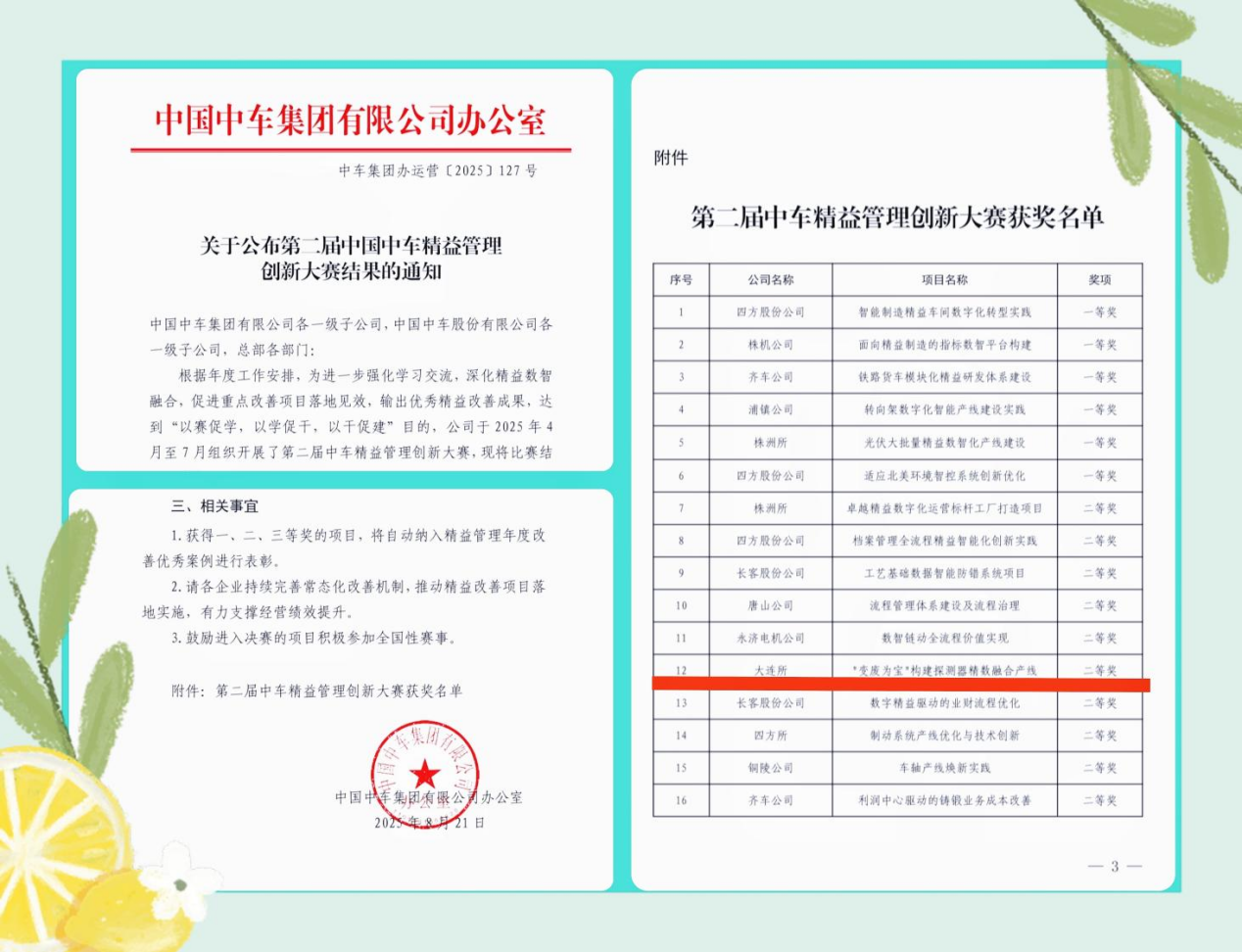近日,中车集团举办第二届中车精益管理创新大赛并公布大赛结果,中车大连所《“变废为宝”协同构建探测器精数融合产线》项目经过激烈角逐,从294个项目中脱颖而出,最终斩获集团二等奖、总排名第12位的亮眼成绩!
