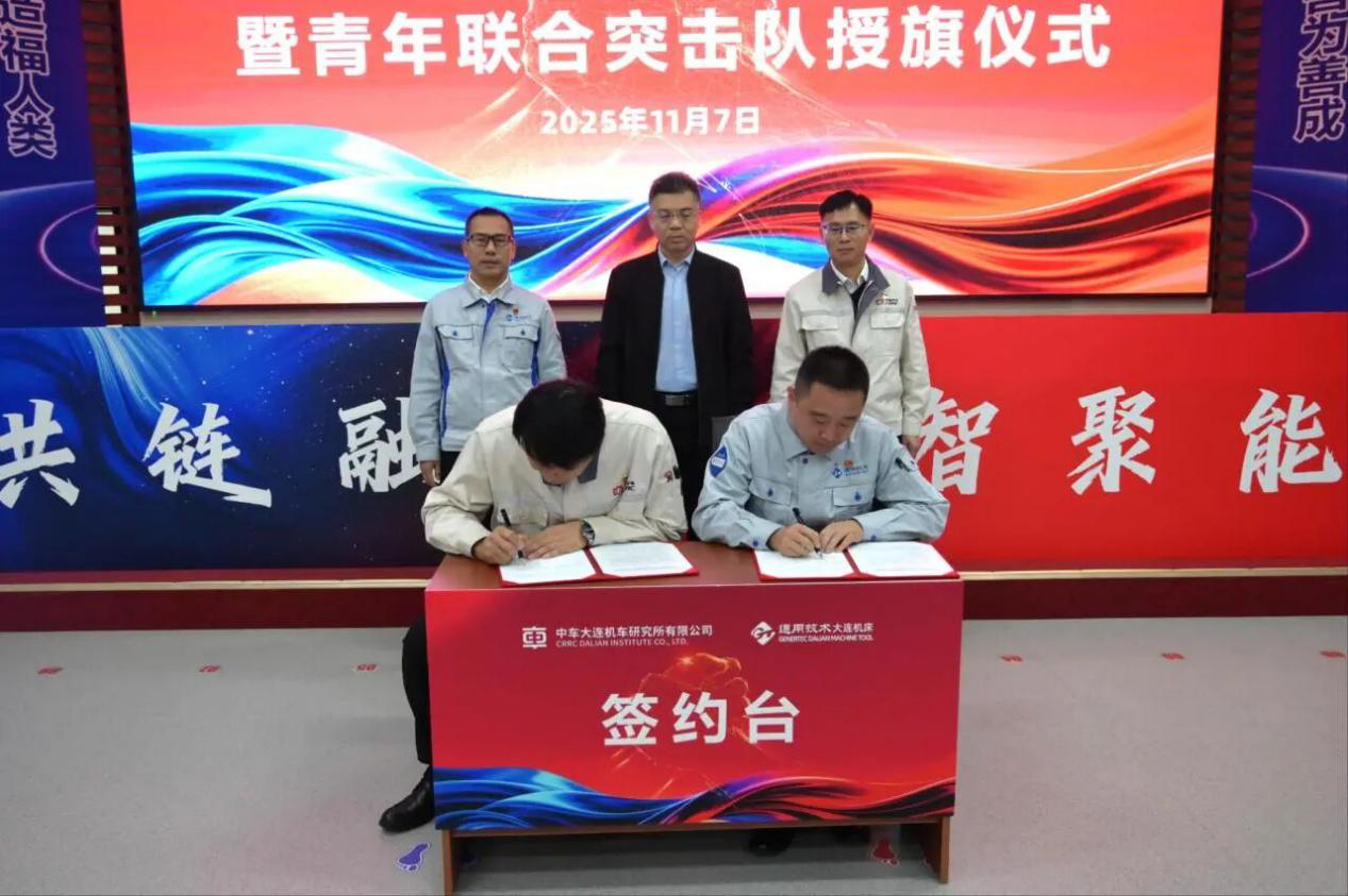 中车大连所&通用技术大连机床公司职工创新工作室联盟签约暨青年联合突击队授旗仪式圆满举行。11月7日上午,在中车大连所旅顺所区,以“共链融合 集智聚能”为主题,两家企业职工创新工作室联盟签约暨青年联合突击队授旗仪式隆重举行。