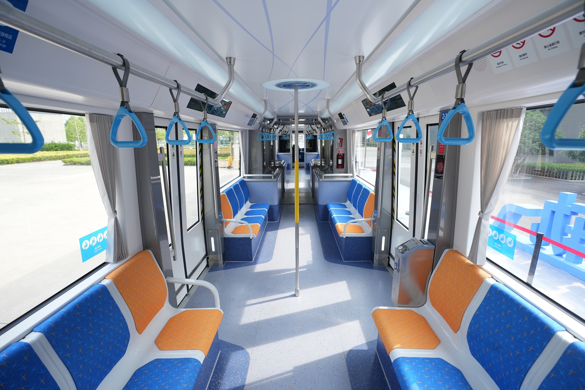 The 30-meter-long train consists of three structurally independent modules, and features a maximum capacity of 280 passengers, a maximum running speed of 70 kilometers per hour, and energy consumption of only 3-4 kilowatt hours per kilometer. Unlike the traditional urban rail transit systems such as subway trains and trams, the new urban smart fast rail train uses rubber wheels instead of steel ones. By laying guide lines or embedding magnetic nails on the existing roads, the “optical recognition” or “permanent magnet induction” technology is leveraged to perceive and predict the running trajectory of the train for tracking navigation.