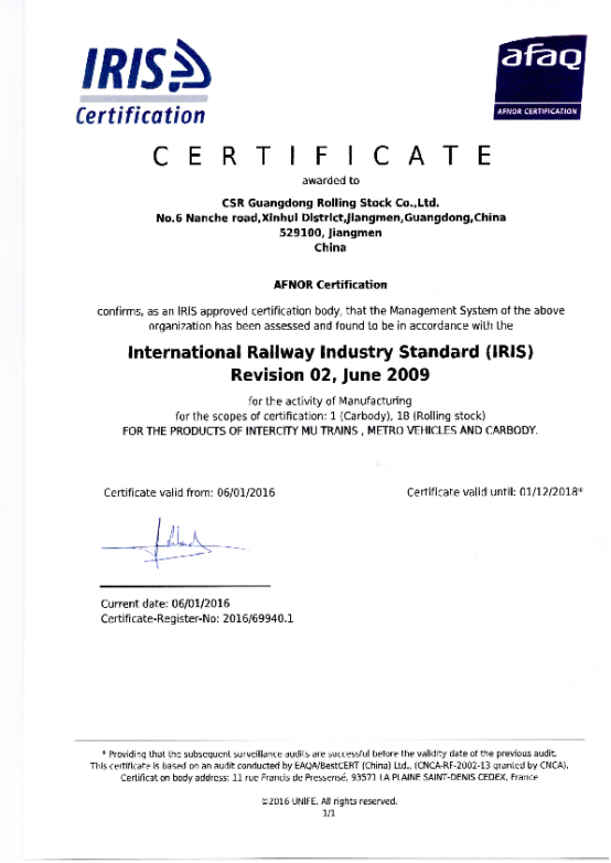 公司积极与世界先进的管理方法接轨,于2016年1月6日获得IRIS管理体系认证证书,首次IRIS认证审核得分为62分,认证范围为城际动车组、地铁整车和车体的制造。