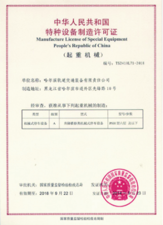 在立体停车设备方面,公司获得了制造许可证,主要产品:多层(六层及以下)机械式升降横移式(PSH型)立体停车设备、二层升降横移式立体停车设备、简易升降式立体停车设备等。