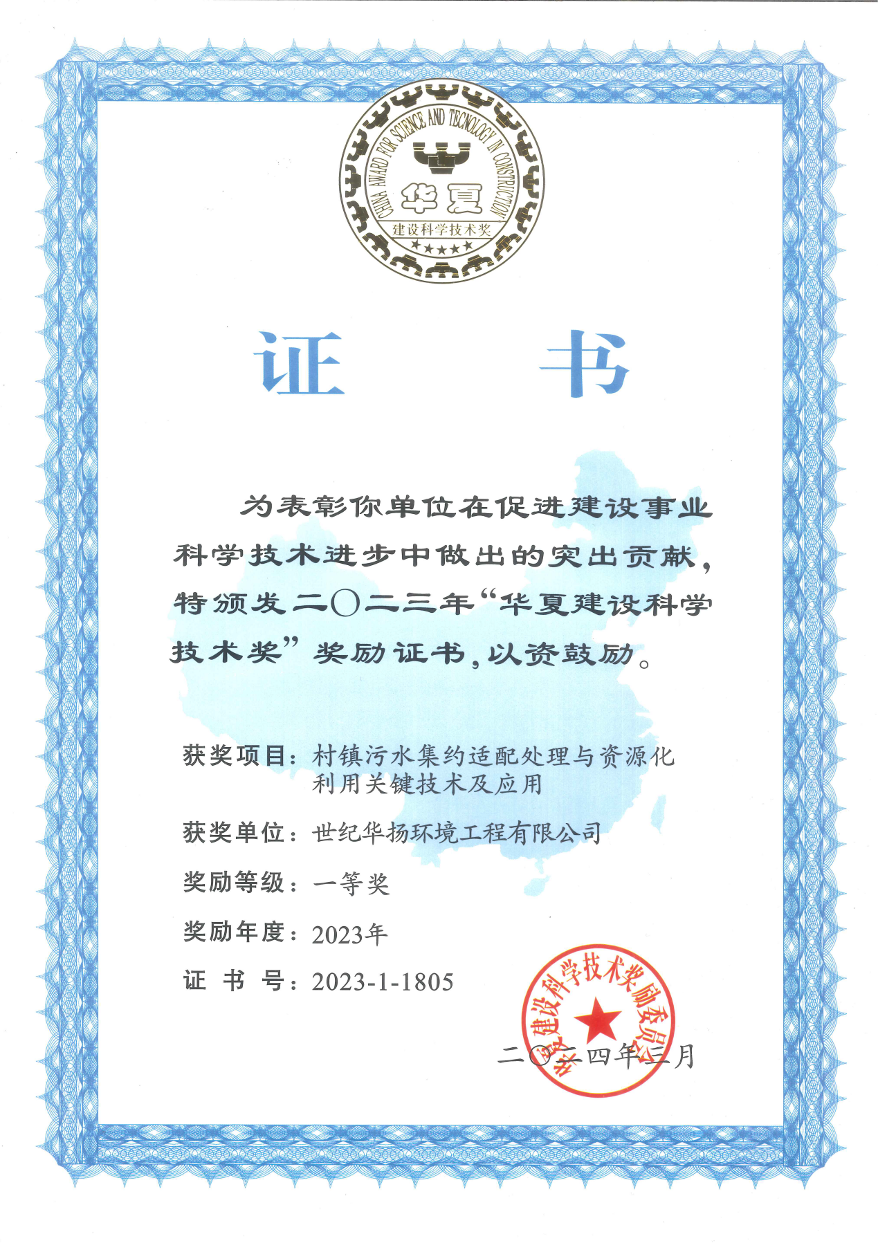 3月12日,国家住建部华夏建设科学技术奖励委员会发布2024年第1号公告,公布了获得2023年度华夏建设科学技术奖的项目,世纪华扬环境工程有限公司联合同济大学申报的项目“村镇污水集约适配处理与资源化利用关键技术及应用”荣获一等奖。