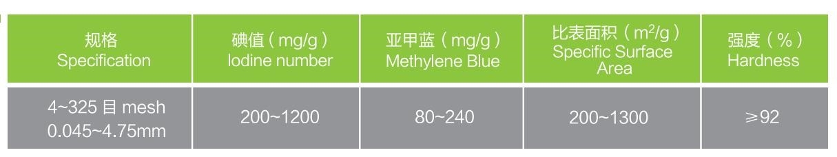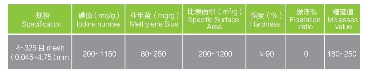 以优质椰子壳、杏壳等为原料,经一系列生产工艺精制而成。优点是孔隙结构发达,比表面积大,吸附性能强,化学性能稳定,易再生。广泛应用于食品、医疗、矿山、冶金、石化、炼钢、烟草、精细化工等行业。尤其适用于高纯度生活饮用水、工业用水深度净化等方面。