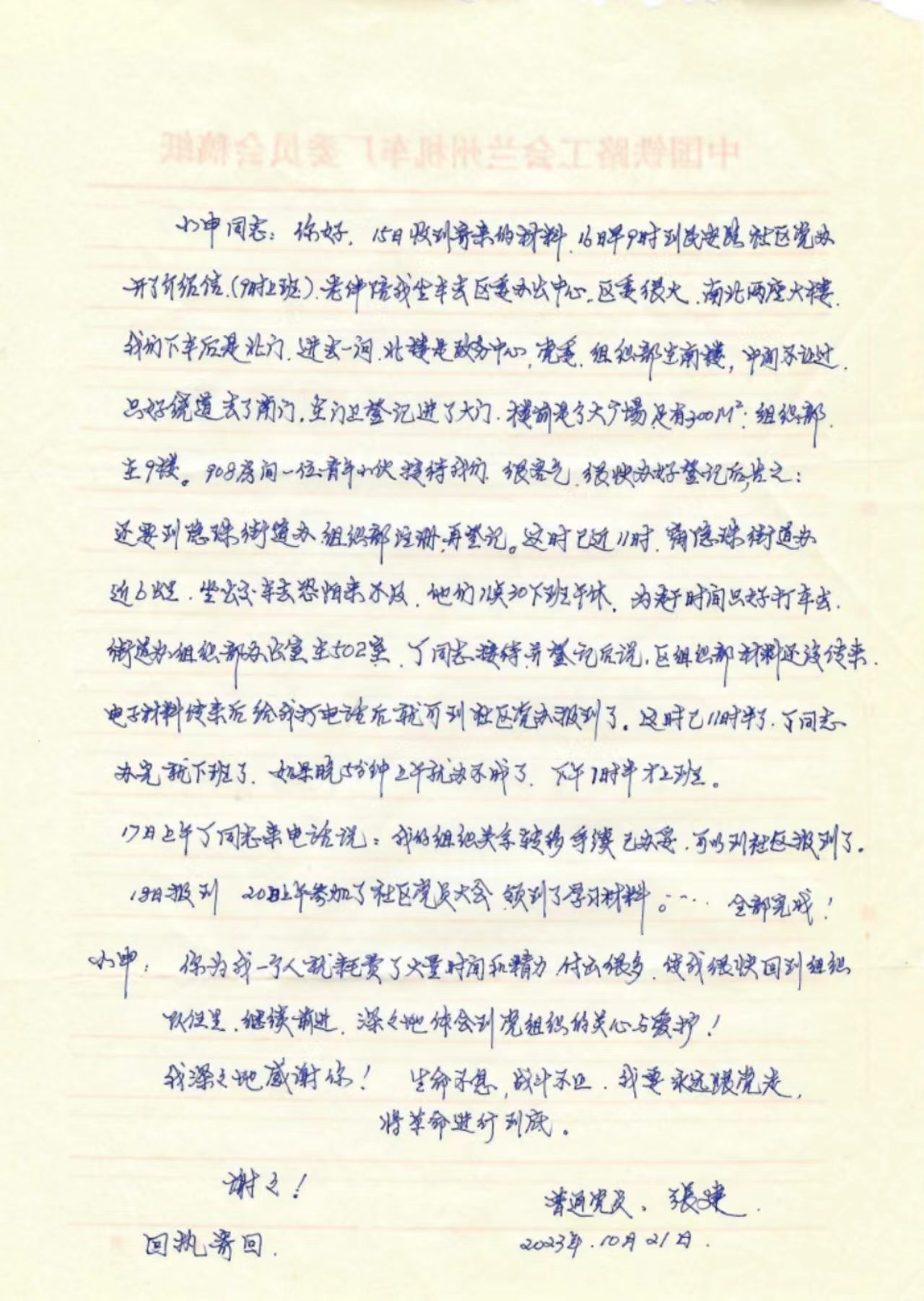 半个月后,我收到了一份挂号信,打开信封看到老同志亲笔写的感谢信,我激动又欣慰。泛黄的信纸背面写着“中国铁路工会兰州机车厂委员会稿纸”,熟悉感扑面而来。在这个电子信息包装的时代,这封手写信显得弥足珍贵。我想象着他戴着老花镜,从封存的时光里撕下记忆最鲜艳的一瓣,用蓝色钢笔字一笔一画写着三十年不变的“初心”。我看了一遍又一遍,小心翼翼地将它折起来保存好。其实应该是我感谢他,一份小小的工作,联通了两代人的心灵,我感慨他一辈子为自己是一名共产党员而骄做,时刻以党员标准要求自己的党性原则和忠心赤诚,他影响了像我一样的一代又一代共产党人。从他身上我更加深刻地领悟了什么是坚守初心、执着忠诚,他的一声“谢谢”,不仅是对我这份工作价值的肯定,更是让我重新思考产党员这一身份背后的光荣使命和神圣职责。