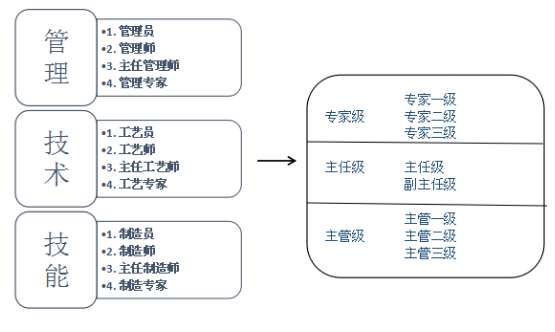 根据专业技术水平和业绩、能力等将层级设置为:专家级、主任级、主管级。专家级分为专家一级、专家二级、专家三级;主任级分为主任和副主任级;主管级分为主管一级、主管二级、主管三级。