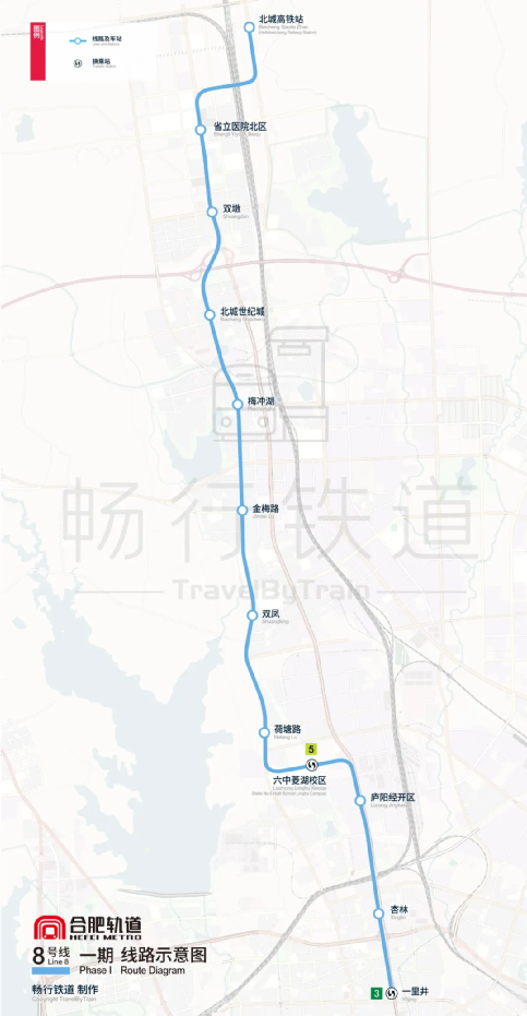 合肥轨道8号线一期工程正线全长22.5千米,均为地下线,设站12座,其中换乘站2座(在一里井站与3号线换乘、在六中菱湖校区站与5号线换乘)。线路起于一里井站、止于北城高铁站,北端设北城车辆段。线路串联长丰县、北城高铁站、庐阳区,衔接既有运营3号线一里井站,投入运营后将有效加强长丰县与合肥中心主城区之间的联系,对优化城市空间结构、改善周边居民出行条件等具有重要意义。