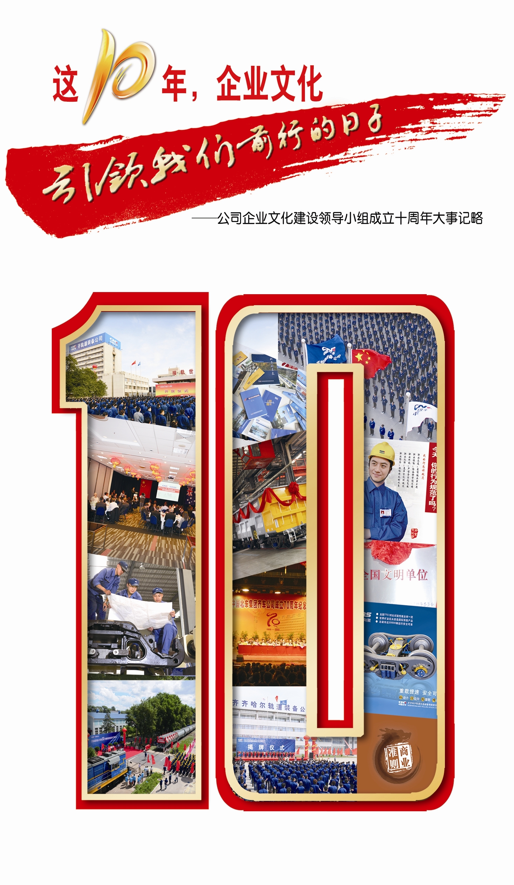 十年来,公司企业文化建设深入开展,实现了由原齐车公司理念体系向由中国北车核心理念和具有自身特色的行动纲领有机结合的齐轨道装备公司理念体系的转 变;由《职工行为规范》制度层面要求和分散式宣贯向开展集中性、递进式活动和突出岗位、工种个性化规范的行为文化建设的转变;由齐车公司完善的形象文化体 系向中国北车形象文化体系并迅速提升形象影响力的转变;由企业文化工作基本自行循环向生产经营多领域以及品牌建设、公共关系工作拓展融为一体不可或缺的转 变。 公司先后荣获全国文明单位、全国企业文化建设优秀单位、中央企业思想政治工作先进单位、中央企业企业文化示范单位称号。