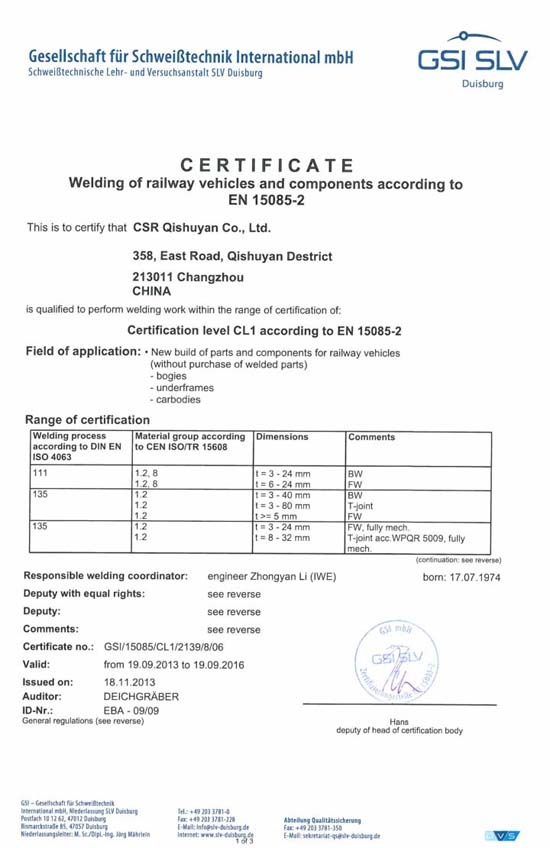 EN15085-2焊接体系认证证书