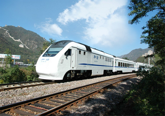 NDJ3 “Harmony and the Great Wall” DMU is developed under the transportation demand of Beijing Olympic Games, which commutes between Beijingbei and Yanqing. This DMU is a “2 motor-cars and 7 trailing cars” unit with one motor-car at each end and seven trailing passenger cars fixed in between.The locomotive is equipped with 12V280ZJ diesel engine. The Maximum running speed is 160km/h.