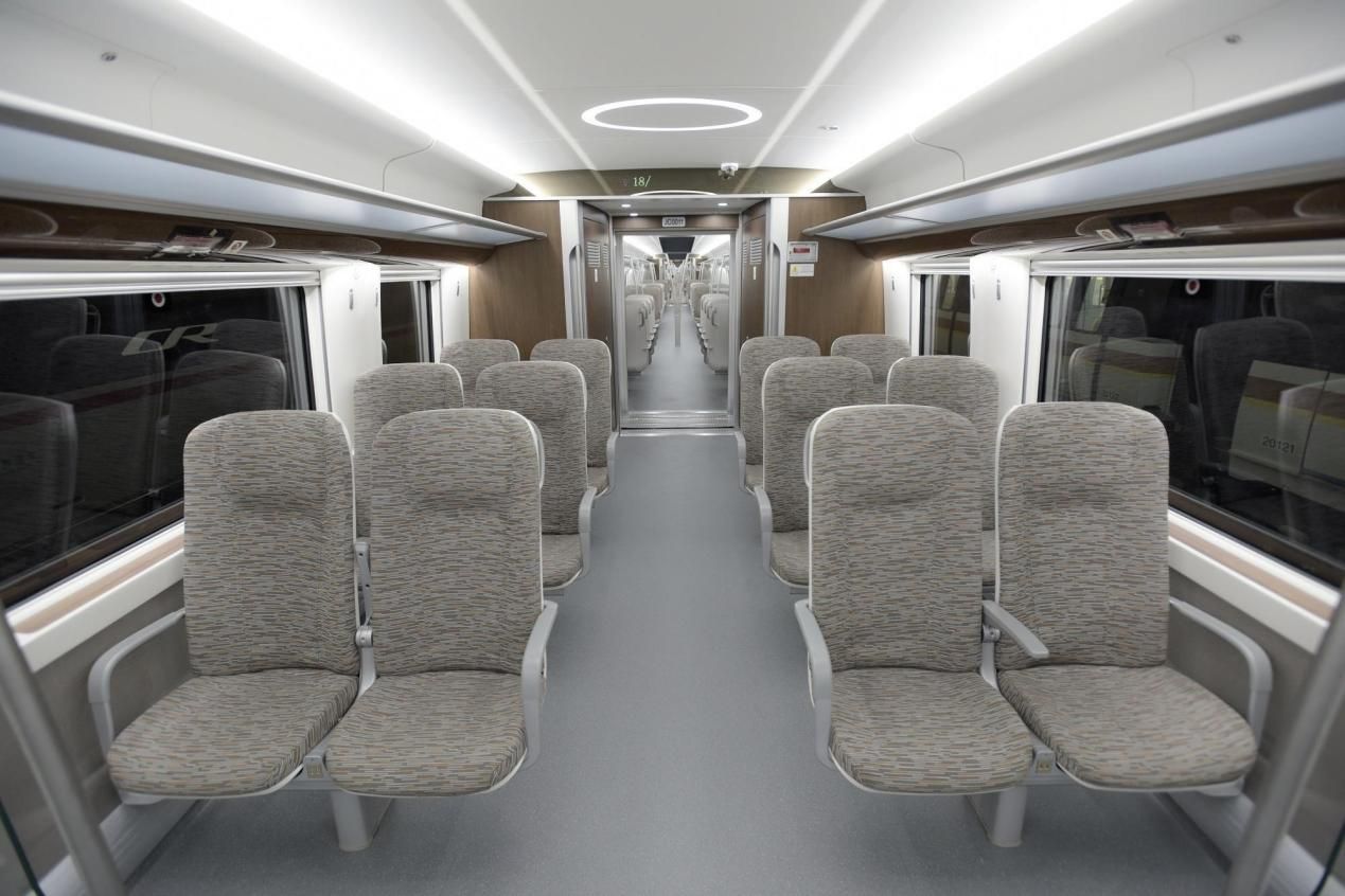 3)高舒适:整车气密性能好,设置压力波动控制系统,可降低车辆隧道运行时车内压力波动,提升旅客的乘坐舒适性;新风量充足,人均新风量可达12m3/人/小时;运行平稳性高,通过系统匹配、悬挂参数优化,获得优良的车辆动力学性能;车内噪声低,客室内噪声(地上)不高于70dB(A),远小于城市轨道交通国标75dB(A)噪声限值要求。