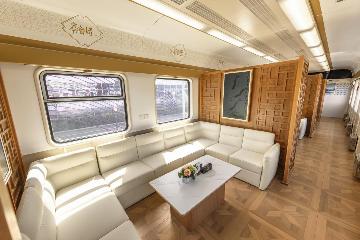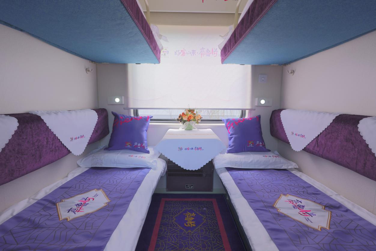 “好客山东·齐鲁1号”旅游列车是在既有普速客车基础上进行适老化、舒适化改造,融入山东文化特色,升级休闲娱乐观光服务功能,集“吃住行游购娱”于一体的山东特色旅游列车。由十四辆客车和一辆发电车组成,客车包括三辆硬座车、两辆娱乐功能车、两辆餐车、两辆软卧车和五辆硬卧车,全列设348个座席、72个软卧铺和330个硬卧铺,共计750个定员。