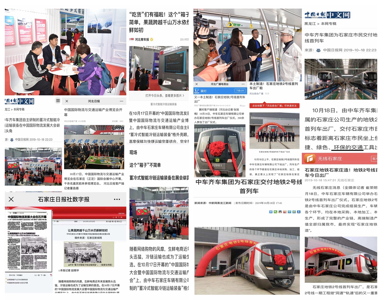 10月17日以来,“中车石家庄车辆有限公司”的名字先后20余次登上主流媒体,公司蓄冷式智能冷链运输装备研制和石家庄地铁2号线车辆生产取得的阶段性业绩被频频报道,其中包括中国日报、中国新闻网、香港商报、今日头条、河北日报、河北电视台等多家有影响力的国家级、省级媒体。