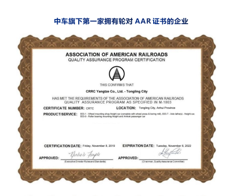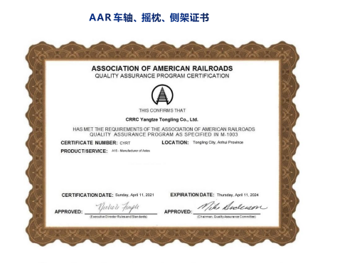 公司先后通过了ISO9001、ISO14000、GB/T28001—2001、AAR、ISO/TS 22163管理体系认证,国家测量管理体系AAA级认证,法国贝尔认证公司的IRIS体系认证。公司车轴产品先后通过了美国铁路协会AAR M-101产品质量认证和AAR M-1003质量保证体系认证。多年来,公司连续十届获得安徽省文明单位称号,先后获得过“全国模范劳动关系和谐企业”、全国“重合同守信用”企业、“安徽省质量管理奖”、安徽省名牌产品生产企业、战略性新兴企业、高新技术企业、铜陵市市长质量奖、等上百项荣誉称号,公司还获批成为省级企业技术中心、省级博士后科研工作站设立单位,RE2B车轴获评安徽省“工业精品”。