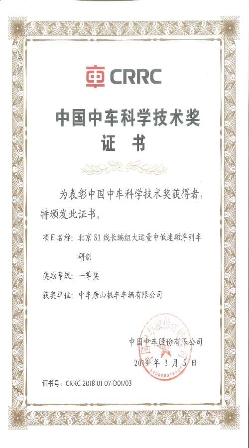 北京S1线长编组大运量中低速磁浮列车研制 科学技术奖 一等奖