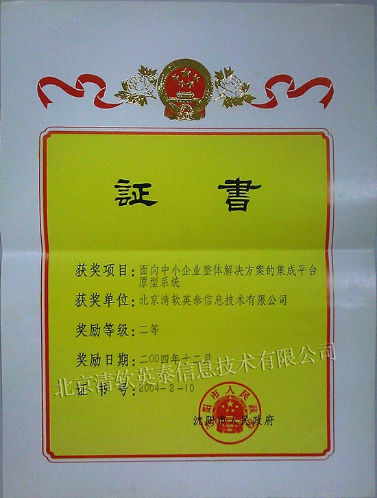 沈阳市科学技术进步奖二等奖(面向中小企业整体解决方案的集成平台原型系统)