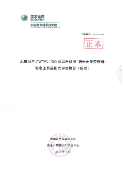 CWT type wind turbines manufactured by CNR have obtained the China Electric Power Research Institute certification, including low voltage ride through capability, power quality, power conditioning, power grids and other functional suitability certification testing, and obtained qualification certificates, met requirements of the grid condition fully.